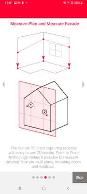 Easily generate intricate wall layouts using P2P technology. This feature is designed for measuring 2D plans on vertical surfaces. You define a vertical plane, and the function will automatically project all measured points onto this plane for precision and clarity in your wall layouts. Then simply export your plans as a dxf or dwg file into your preferred CAD program.