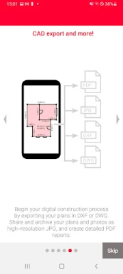 All measurements and floorplans can be exported as a CAD drawing, JPG or in a PDF format. CAD exports are possible as DXF or DWG format, which allows to seamlessly integrate the measurement data with digitized construction. PDF export detailed reports include all created measurements in easy to read and understandable structure.